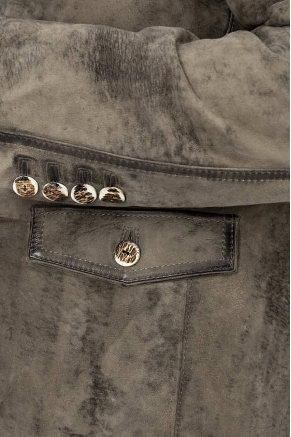 Detailed craftsmanship can be seen in the beautifully designed horn buttons, which run down the front of the jacket and are complemented by the decorative buttoning on the cuffs. These buttons are carved with traditional motifs, adding a layer of refined authenticity to the jacket’s structure. With two slanted front pockets and two smaller chest pockets, the jacket offers both style and practicality. The structured cut and stand-up collar, with a slight rounded shape, highlight the traditional appeal of this Bavarian Suede Leather Jacket.