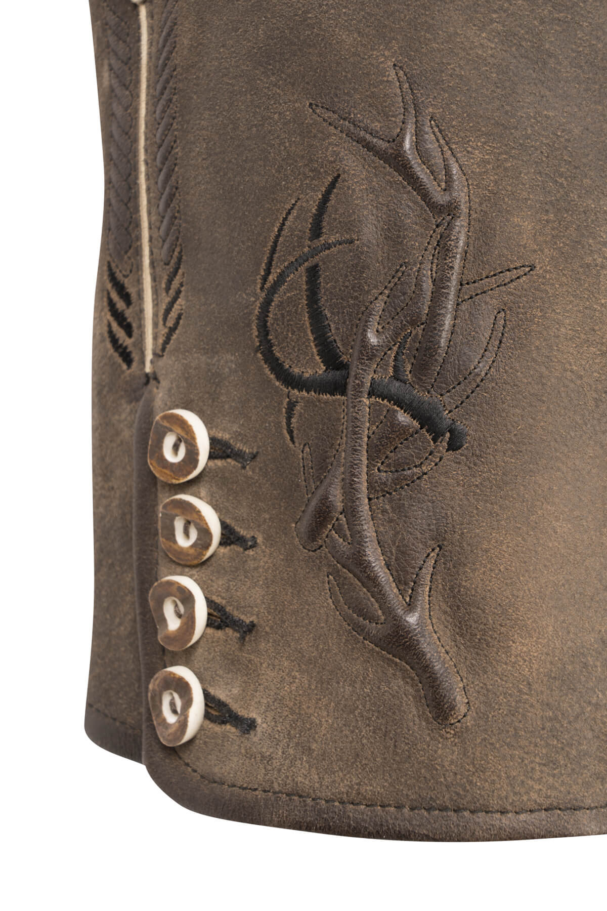 The embroidery on the Denver Lederhosen is both distinctive and masculine. Featuring intricate antler motifs, the embroidery is done in a deep, earthy brown color that contrasts subtly with the lighter brown tone of the suede. These antler designs are carefully placed on the front panels and along the sides, adding a rugged and outdoorsy feel to the lederhosen, perfect for those who appreciate nature and traditional hunting themes.