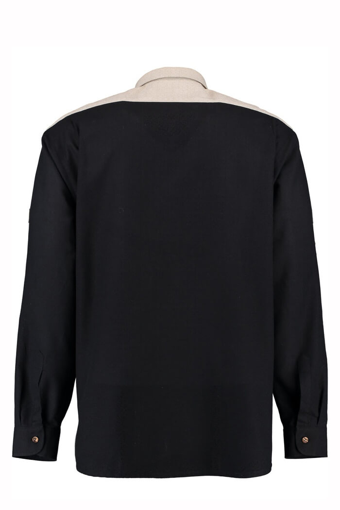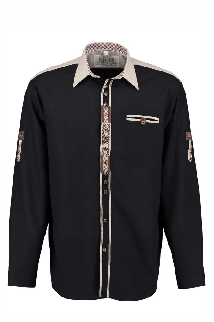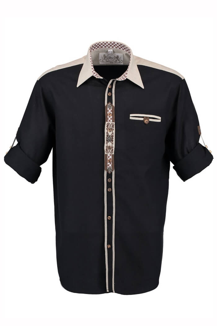 This shirt showcases a sleek black base with beige accents on the collar, shoulders, and placket, creating a bold contrast that enhances its traditional Bavarian appeal. Crafted from premium cotton, it ensures breathability, durability, and all-day comfort, making it perfect for Oktoberfest and other Bavarian festivals. Its high-quality fabric allows for ease of movement, keeping you stylish and comfortable throughout long celebrations and festive gatherings.