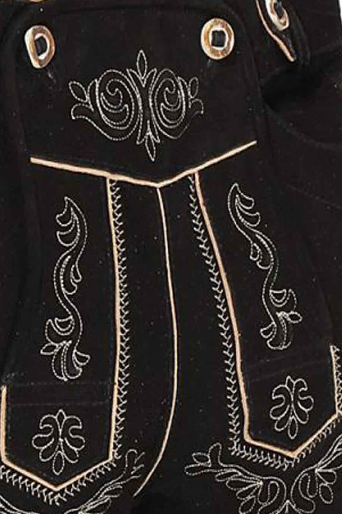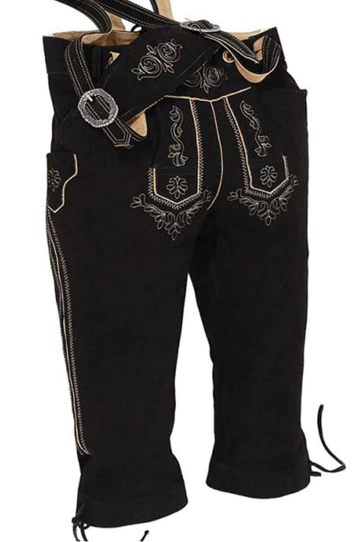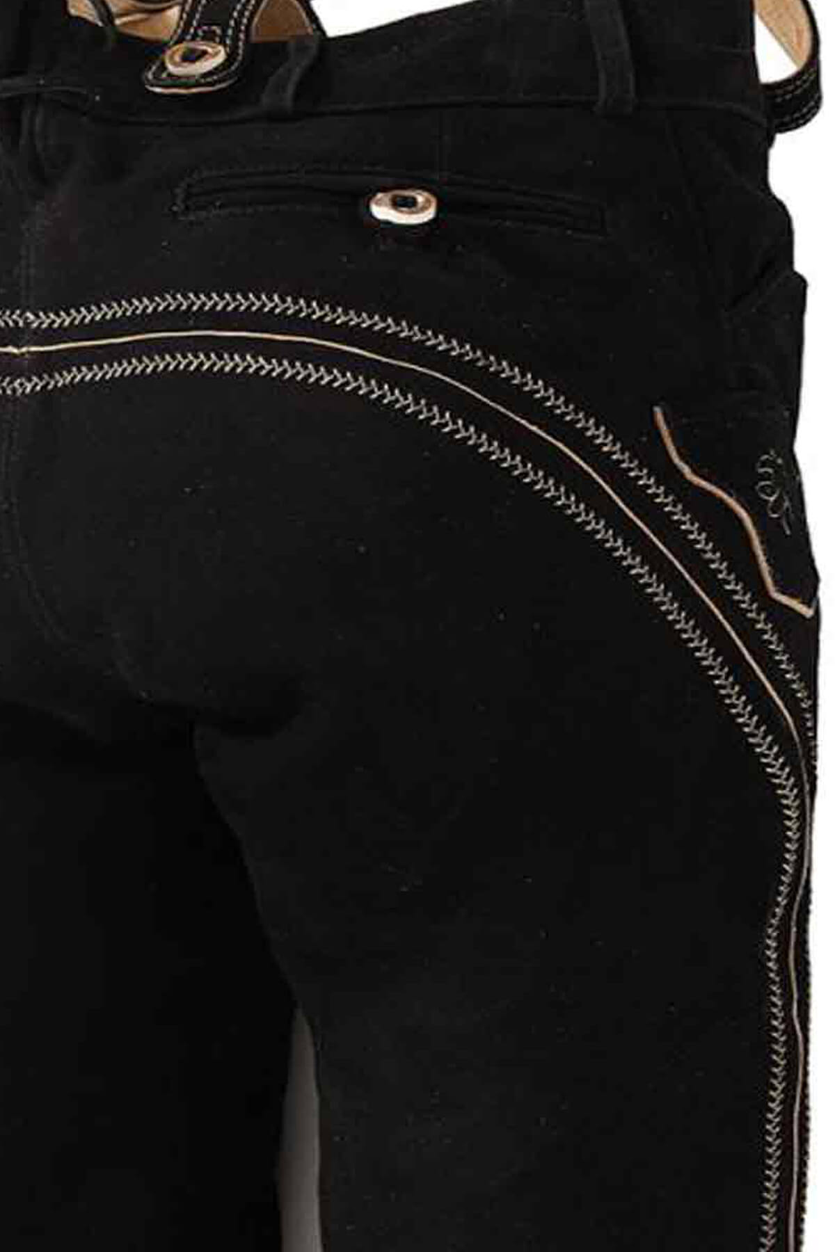 One of the standout features of the Lukas Bundhosen is its intricate embroidery, which adds a touch of artistry to the garment. The embroidery is meticulously crafted in a contrasting white and beige color, creating a striking visual appeal against the black suede background. The design is inspired by traditional Bavarian motifs, featuring elegant floral patterns that adorn the front and back pockets. The subtle yet detailed embroidery not only enhances the aesthetic appeal of the Germsn bundhosen but also pays homage to the rich cultural heritage of the Bavarian region.