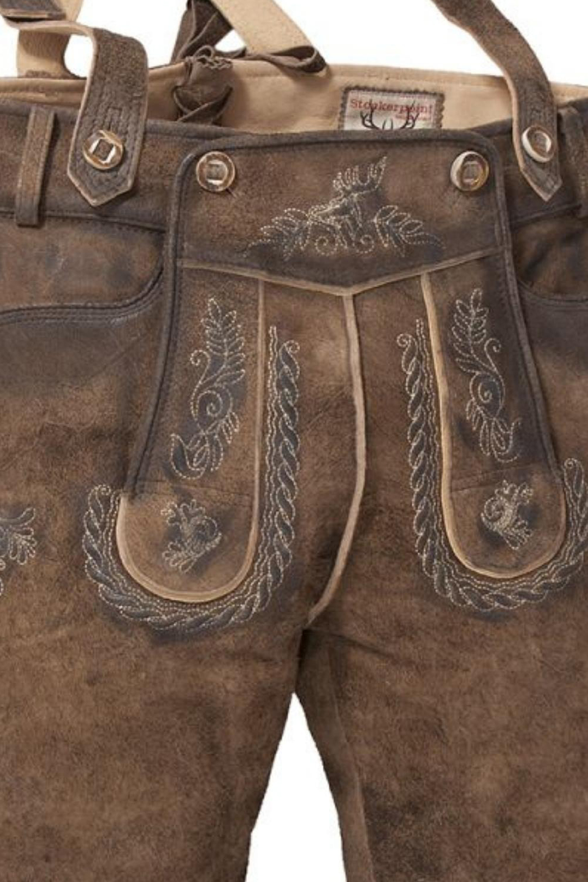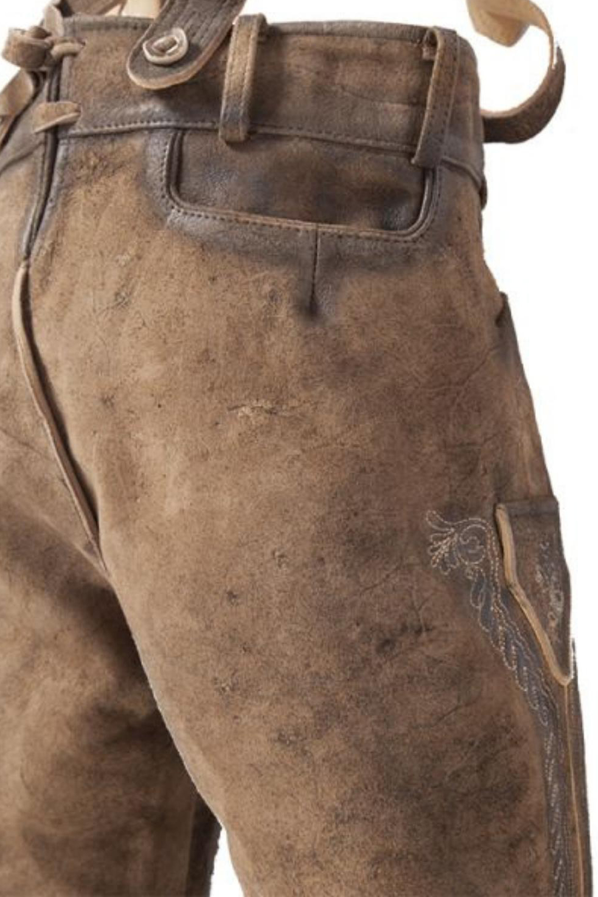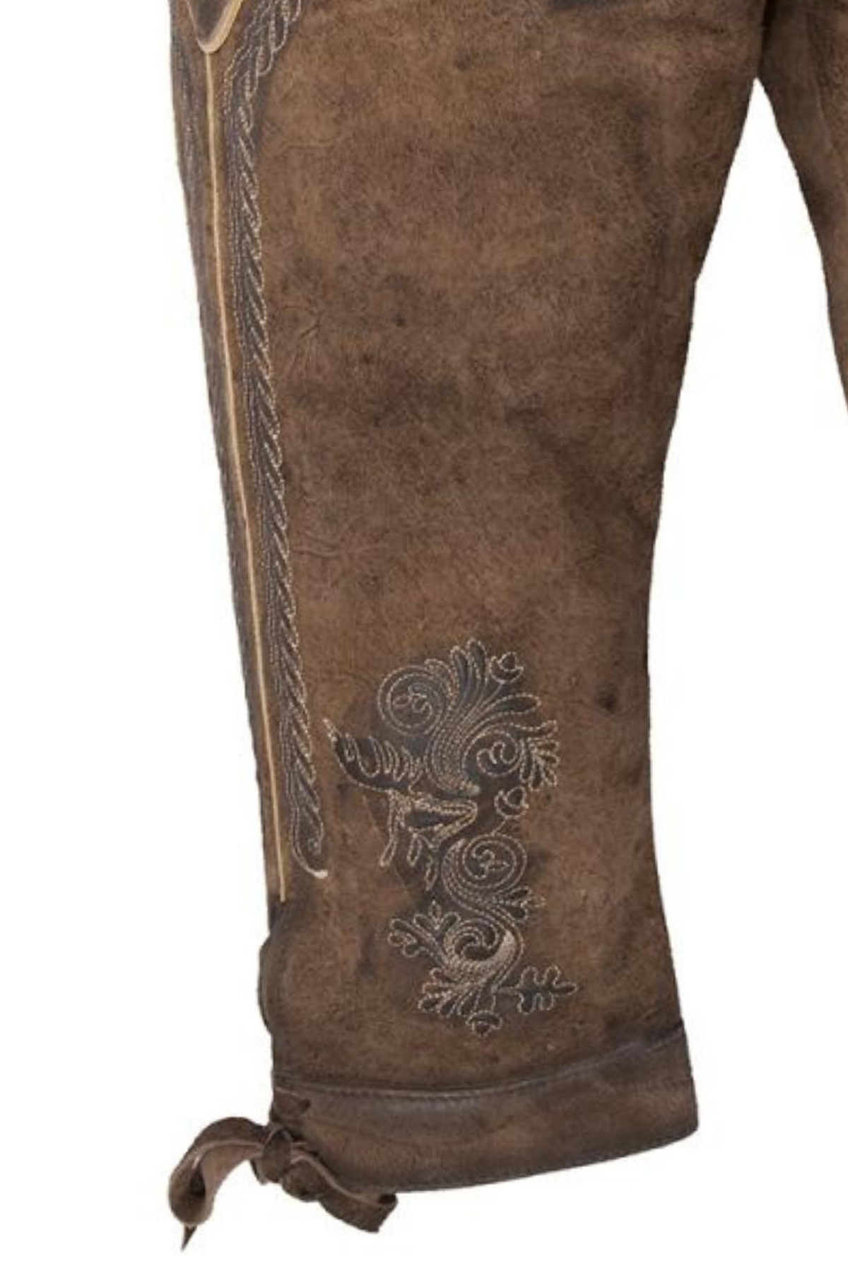 One of the most striking features of the Oslo Bundhosen is the intricate embroidery that adorns various parts of the garment. The embroidery is done in a traditional Bavarian style, featuring delicate floral and foliage motifs that run along the front flap and the sides of the legs. The detailed stitching adds a touch of elegance and authenticity, reflecting the rich cultural heritage of Bavaria. The designs are carefully crafted in a slightly lighter tone, providing a subtle yet eye-catching contrast against the darker suede background.