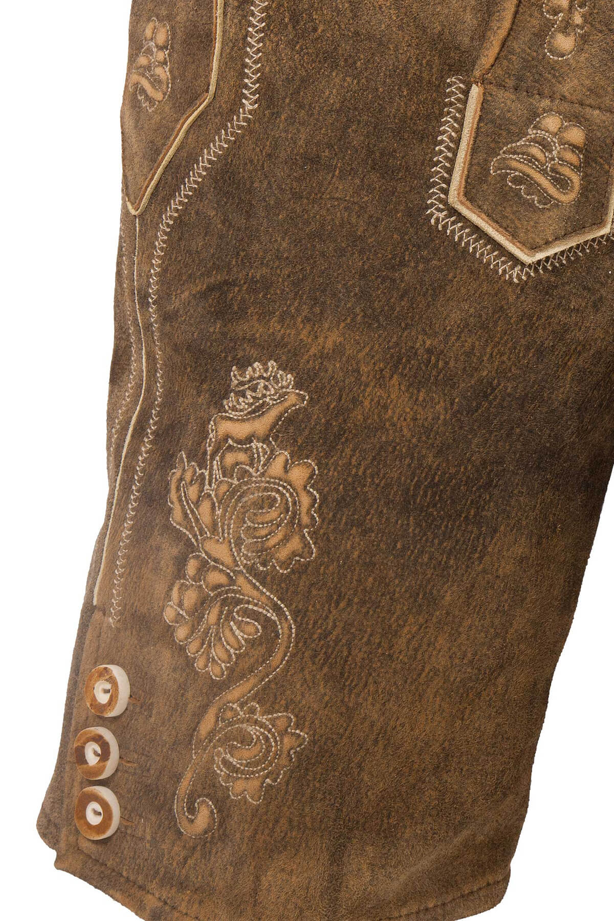 The Prosit Lederhosen by Alpen Lederhosen is crafted from high-quality Brown suede leather, offering a blend of comfort and traditional style. The suede provides a soft, smooth texture that is both durable and luxurious, making these lederhosen a perfect choice for any Bavarian celebration or casual wear. The material’s rich, dark tone serves as an excellent backdrop for the intricate embroidery that adorns this piece.